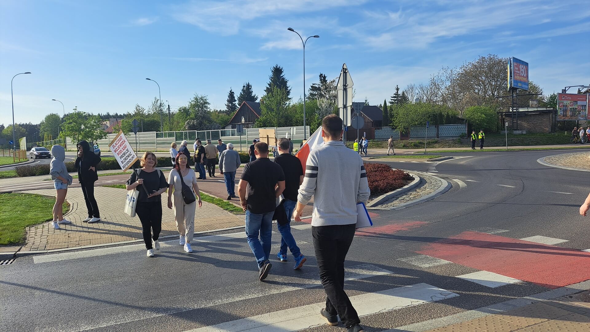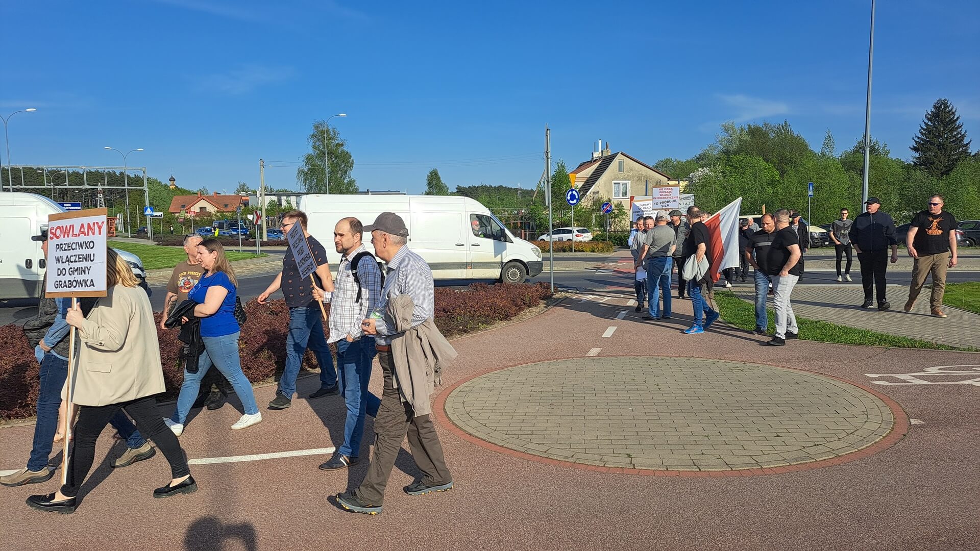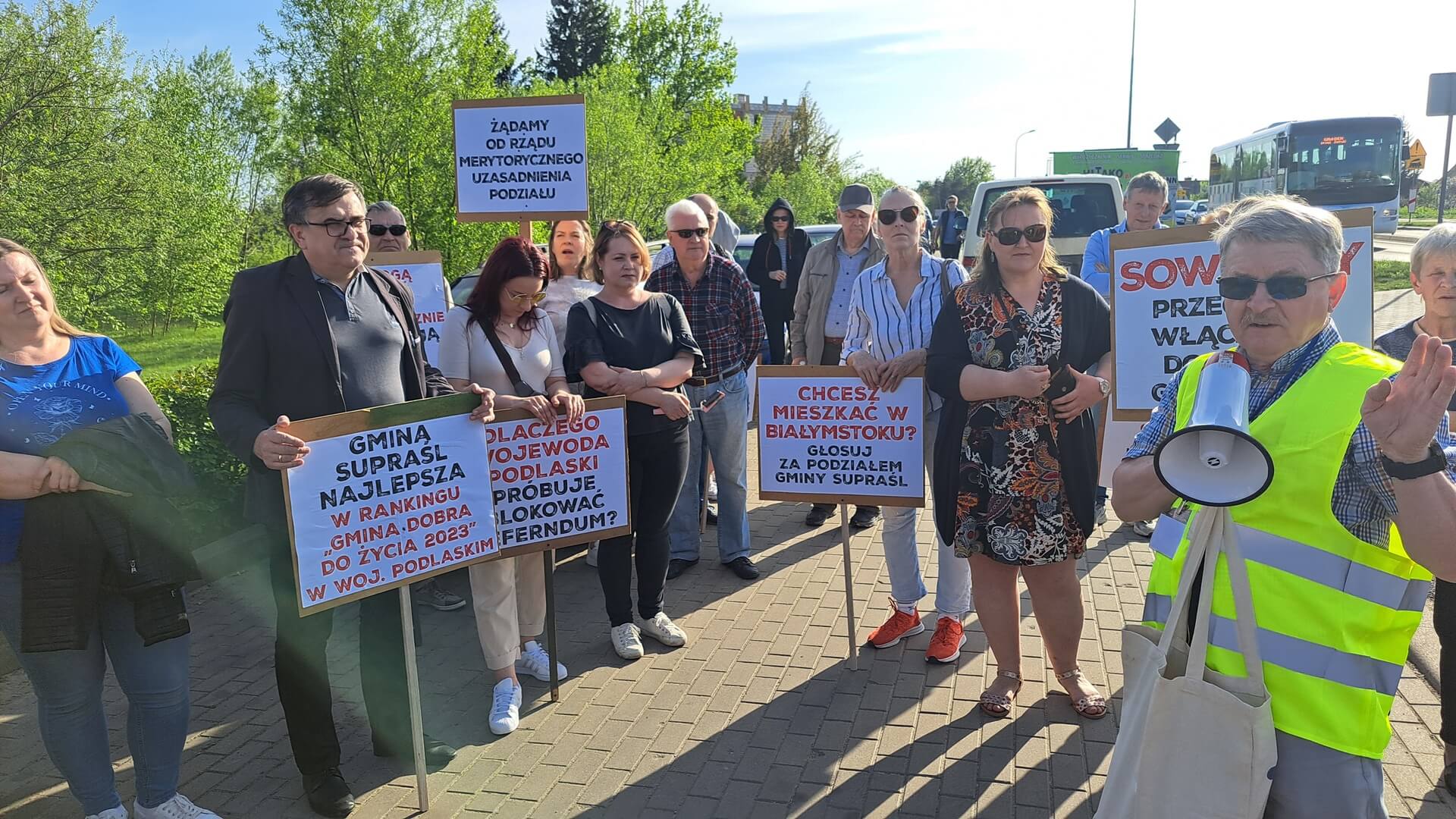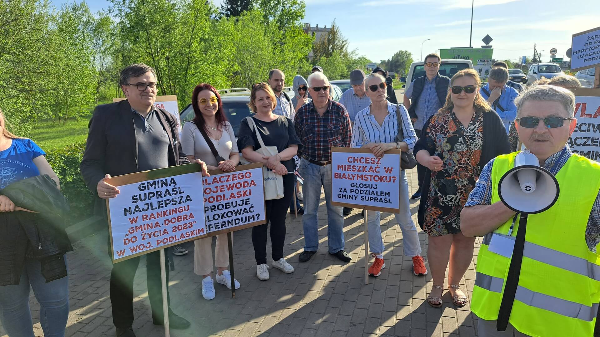 "Nie dla podziału gminy Supraśl", "Protest przeciwko próbie blokowania referendum, "Żądamy od rządu merytorycznego uzasadnienia podziału", "Dlaczego wojewoda podlaski próbuje blokować referendum", "Nie mogą przejąć władzy demokratycznie próbują siłą" - m.in. takie hasła mieli na transparentach przeciwnicy powstania nowej gminy Grabówka podczas swojego - jak to nazwali - protestu ostrzegawczego. Domagali się też, aby Rada Ministrów uzasadniła podział gminy Supraśl. Przez dwie godziny ok. 50 osób(dane policji) chodziło po przejściach dla pieszych z jednej strony ronda w Zaściankach. Policja kierowała ruchem, były objazdy, choć przepuszczano autobusy miejskie, niektóre auta.