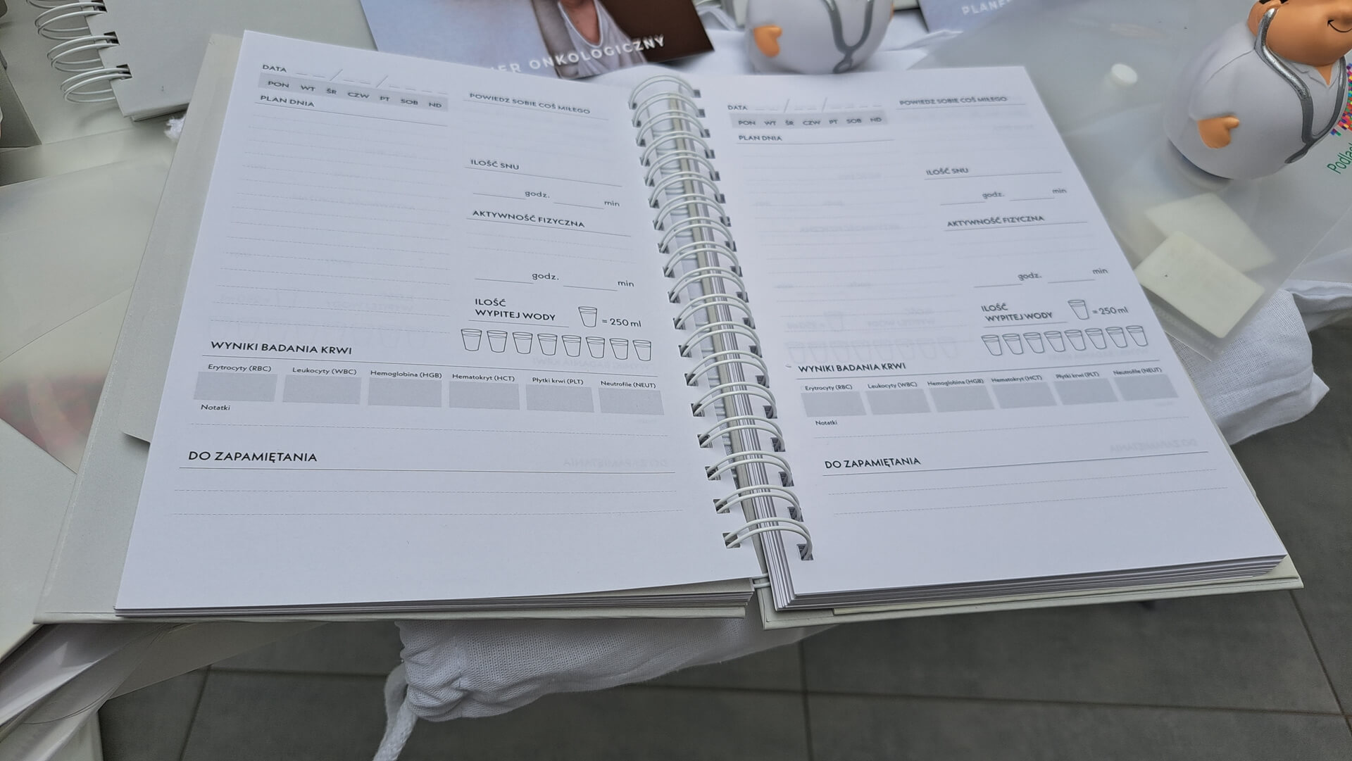 W zeszytach można zapisywać terminy wizyt, ważne badania, numery telefonów do kontaktu z koordynatorami, lekarzami.
