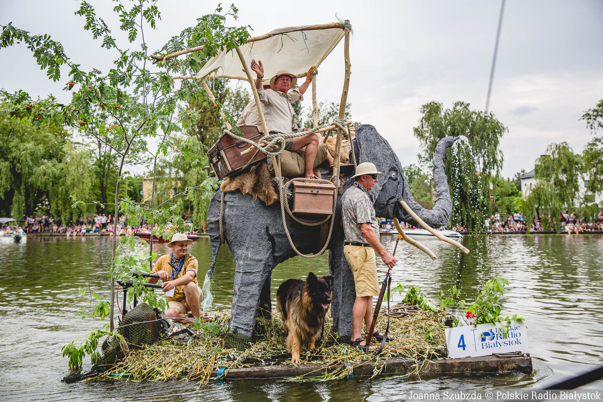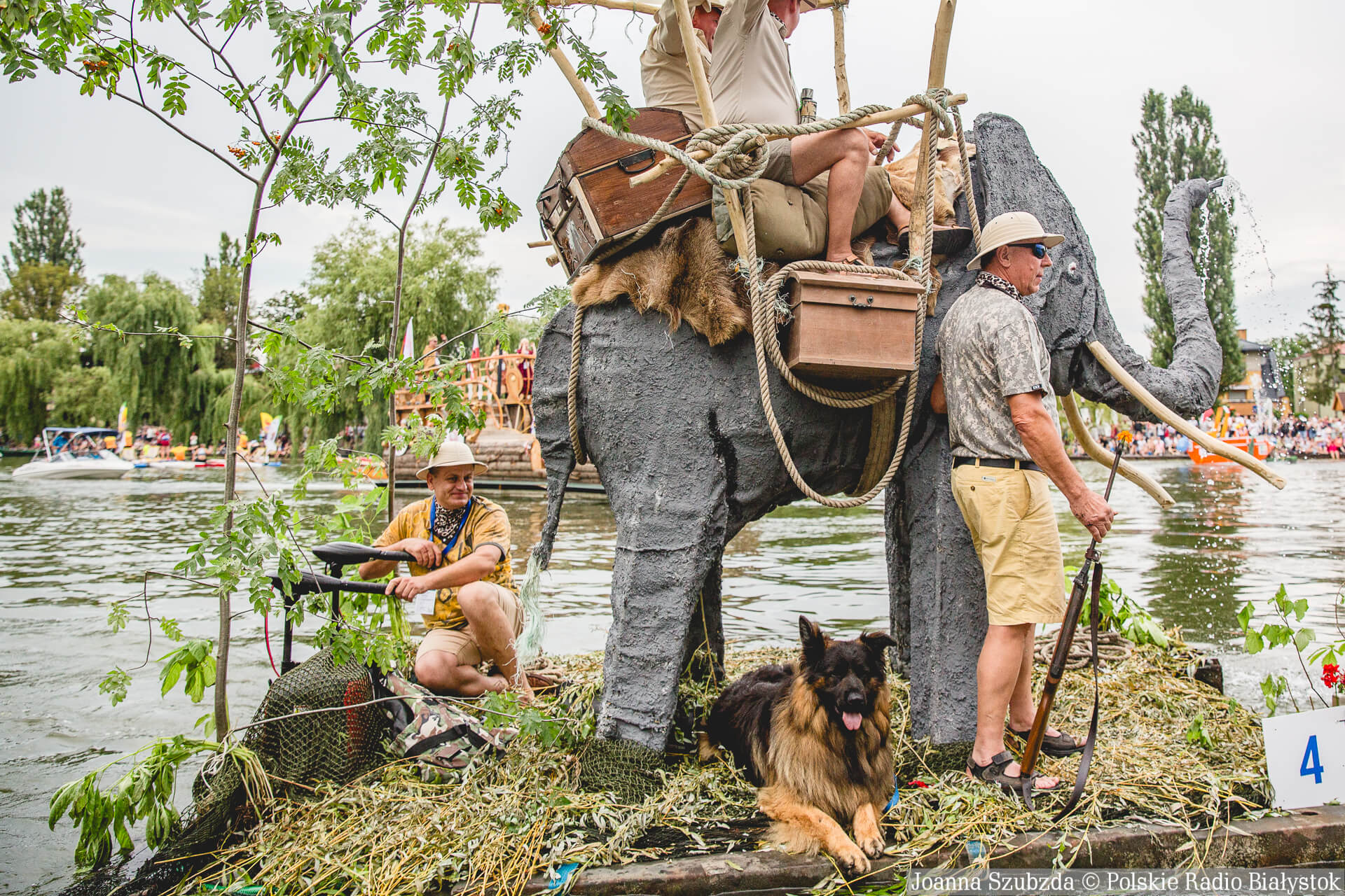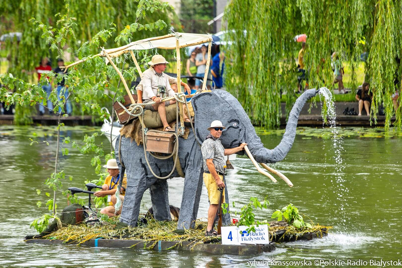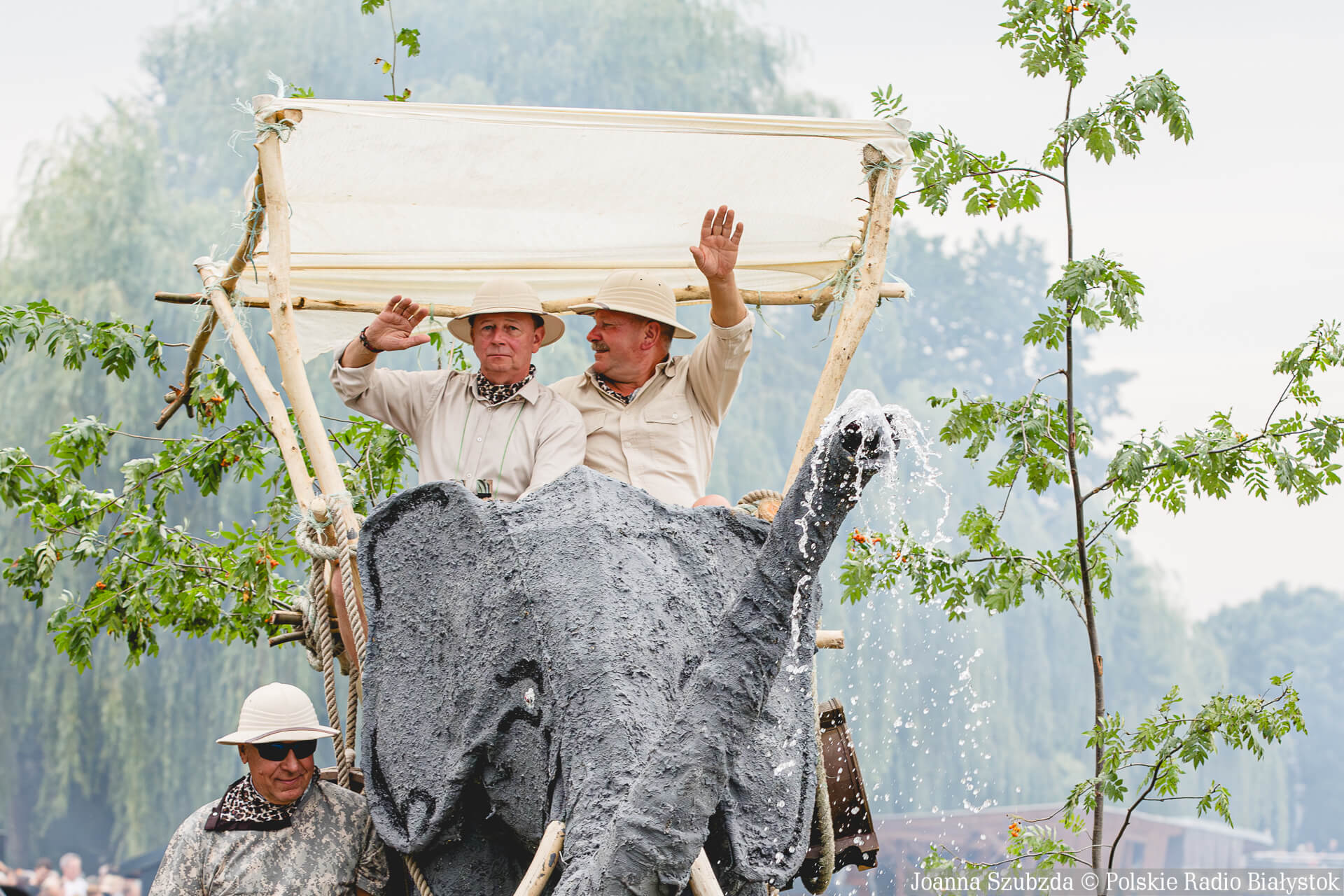 "Słoń Safari" tryskał wodą z trąby, na grzbiecie siedziało dwóch uczestników.