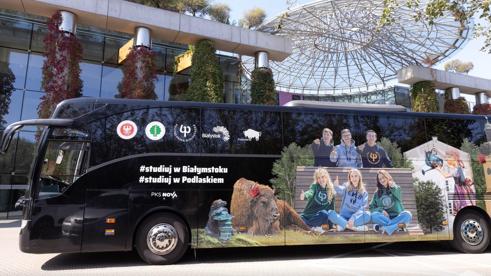 „Studiuj w Białymstoku - Studiuj w Podlaskiem”, - to hasło, jakie zobaczymy na rejsowym autobusie PKS Nova, który poruszać się będzie po regionie. Na pojeździe znajdują się też charakterystyczne białostockie murale oraz uśmiechnięte twarze sześciorga studentów z białostockich uczelni.