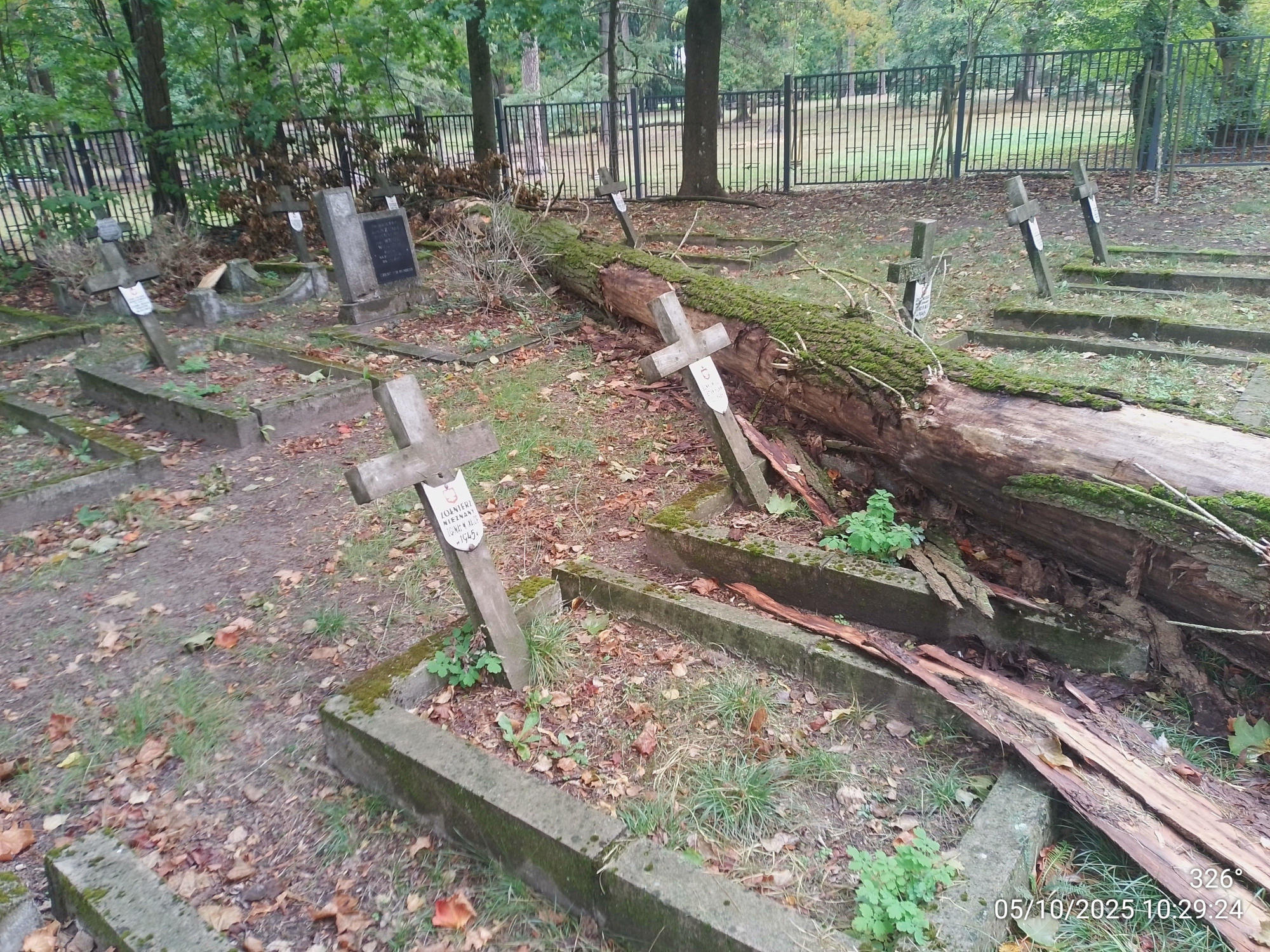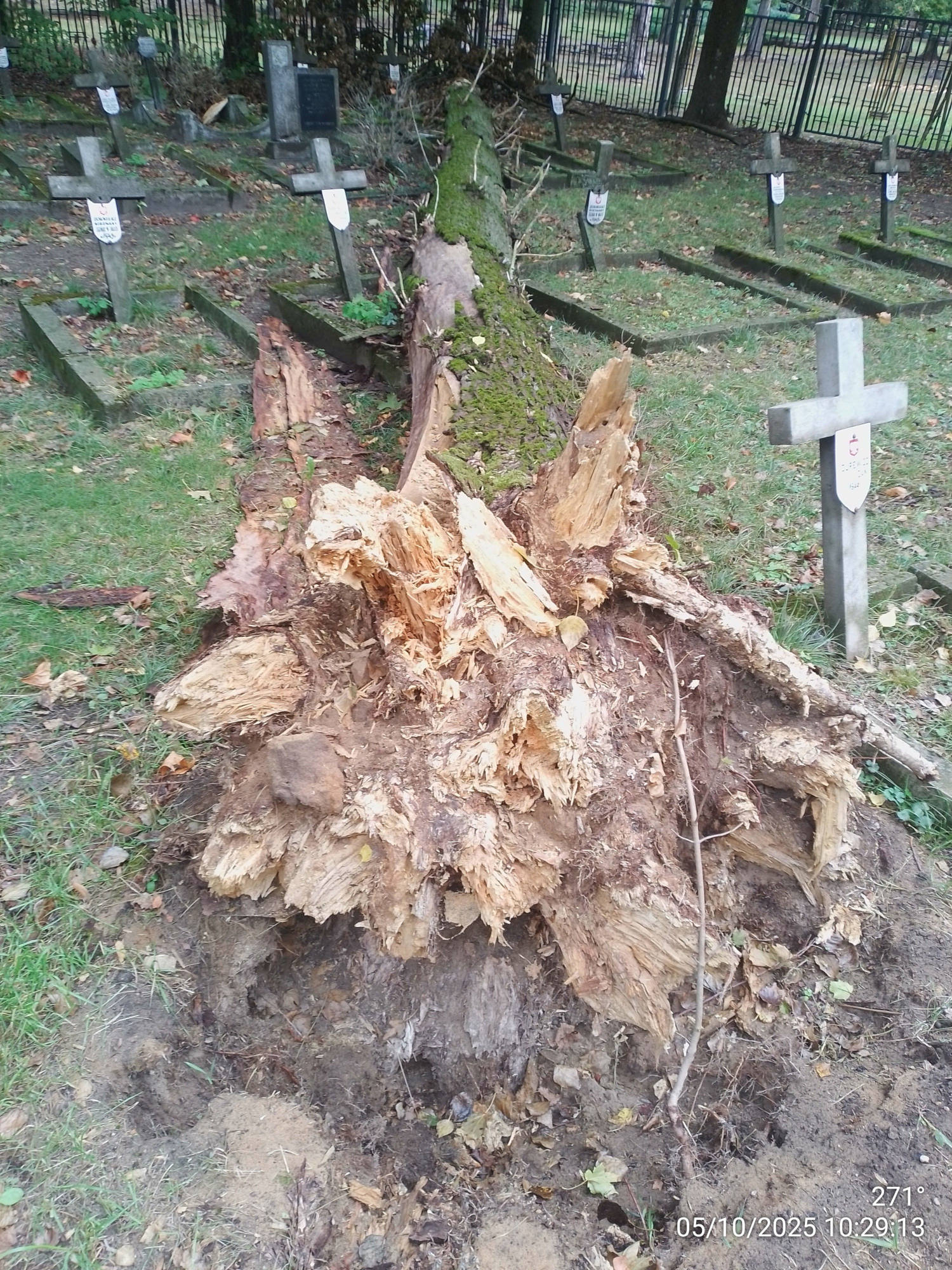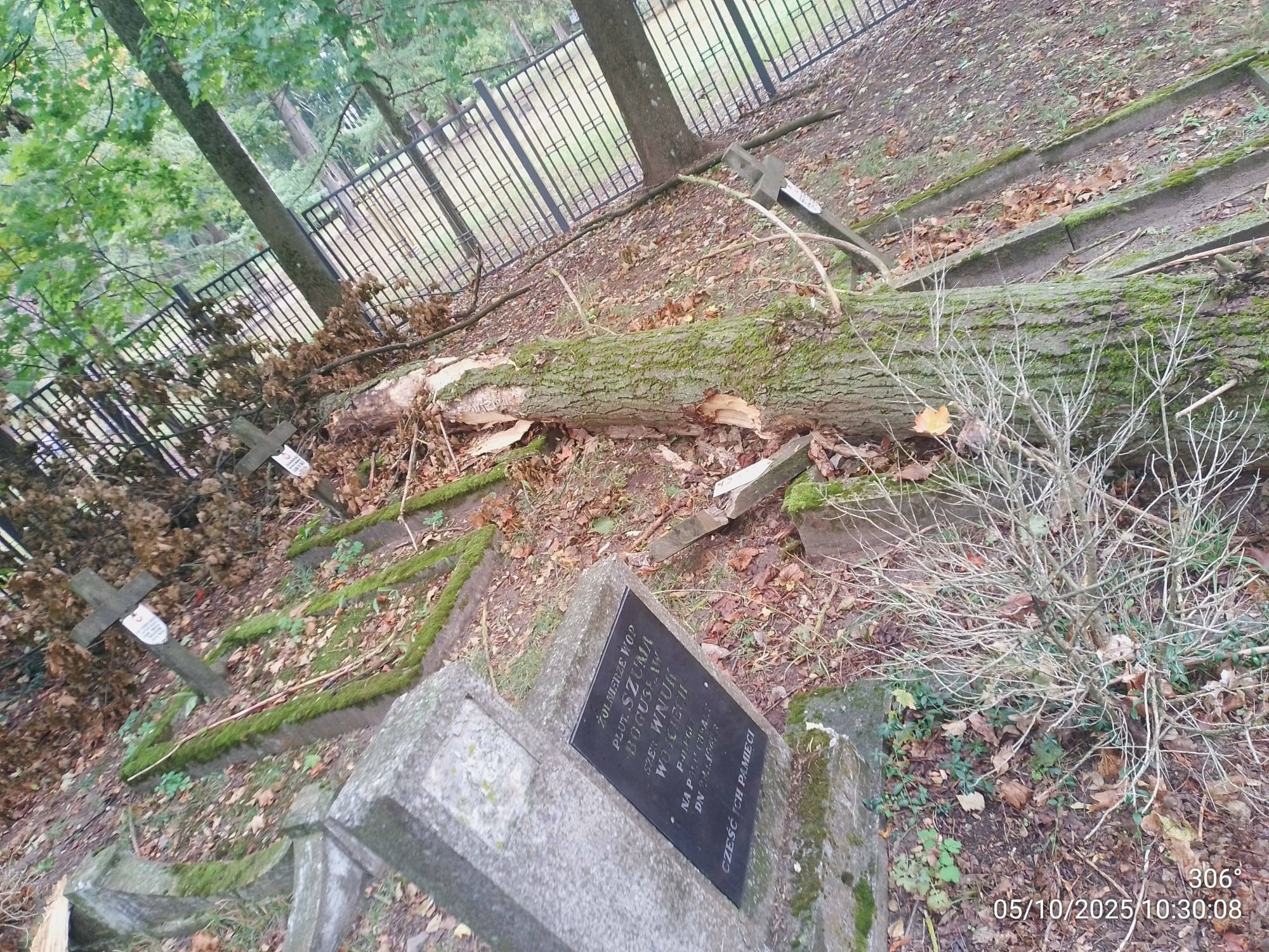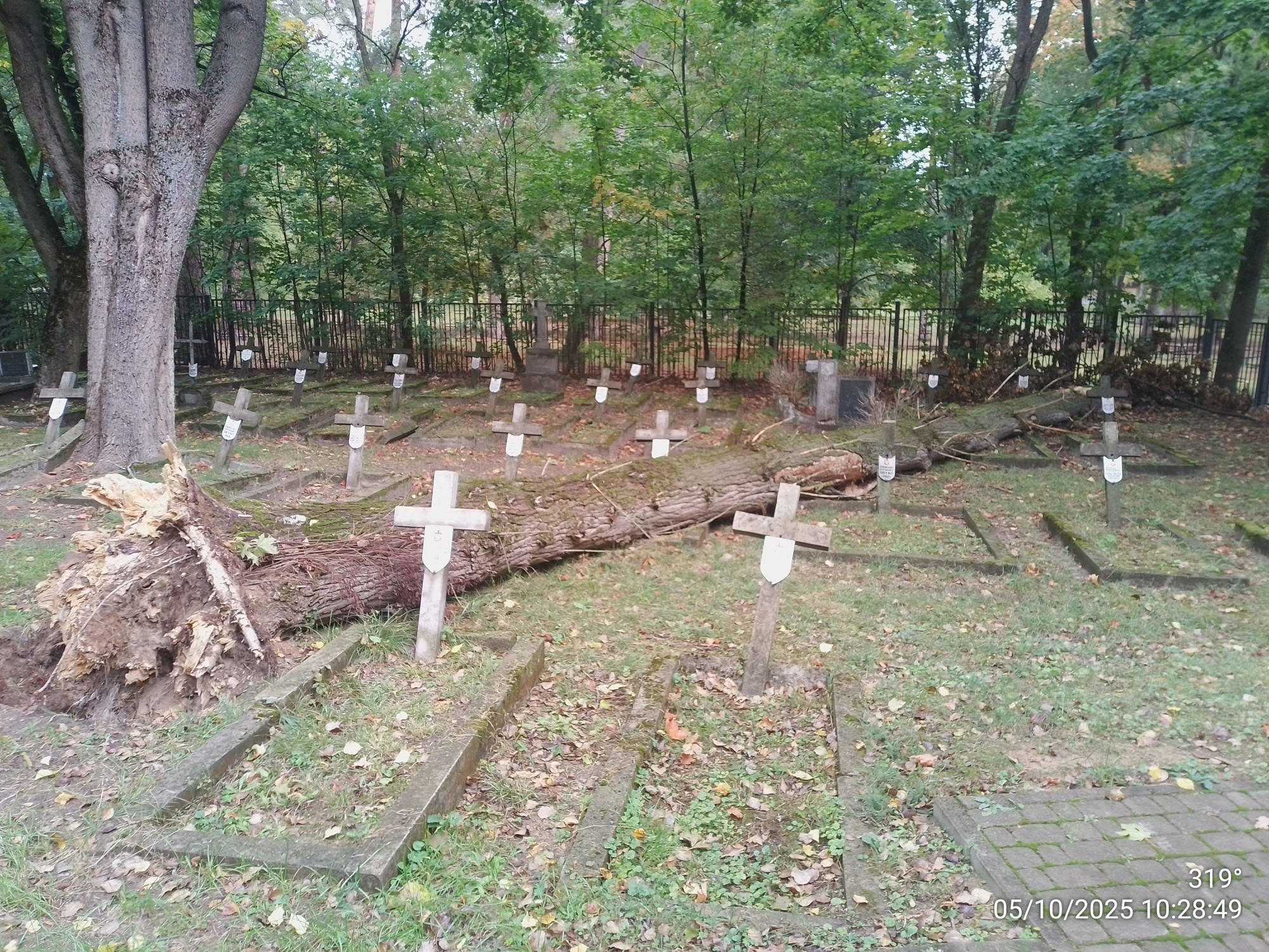 Wyschnięte drzewo rosnące na cmentarzu wojskowym przy ulicy 11 Listopada było przewidziane do kontrolowanej wycinki, jednak zanim do tego doszło, powaliła je sierpniowa wichura. Upadek drzewa był o tyle niefortunny, że konary uszkodziły kilka nagrobków.