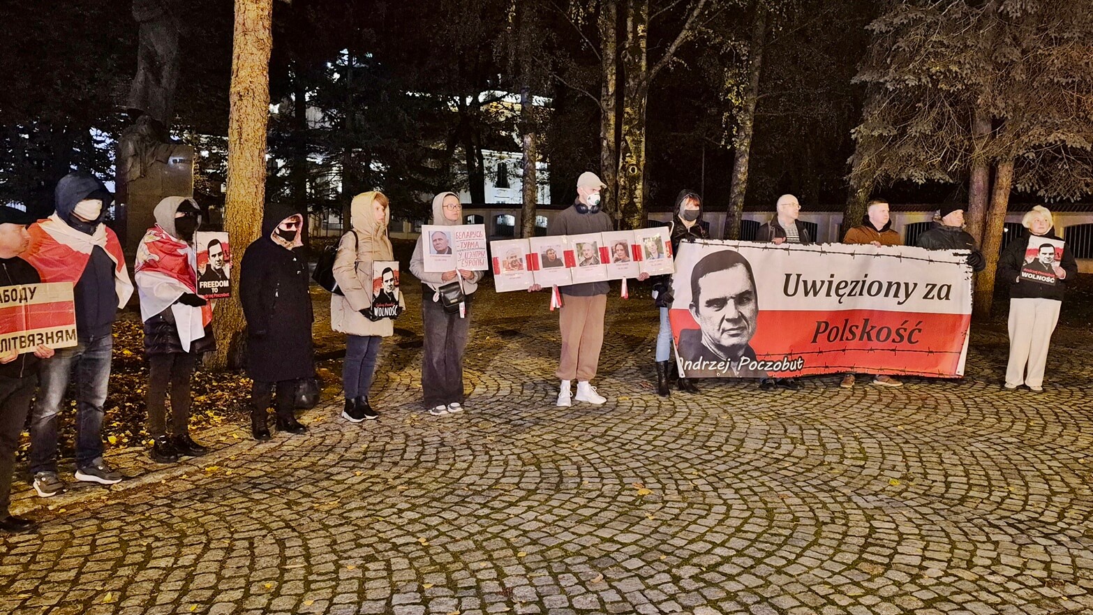 Zebrani mieli ze sobą portrety represjonowanych, biało-czerwono-białe flagi i transparent "Uwięziony za Polskość" z podobizną dziennikarza i działacza Związku Polaków na Białorusi.