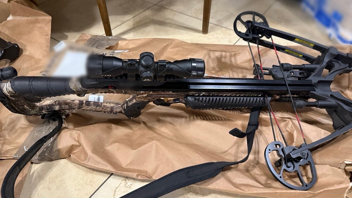 W miejscu zamieszkania podejrzewanego funkcjonariusze zabezpieczyli m. in. różnego typu wiatrówki, kuszę i łuk.